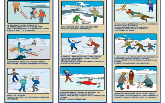 9. В случае провала льда под ногами надо действовать быстро и решительно - широко расставив руки, удержаться на поверхности льда, без резких движений стараться выползти на твёрдый лёд, а затем, лёжа на спине или на груди, продвинуться в сторону, откуда пришел, одновременно призывая на помощь.
